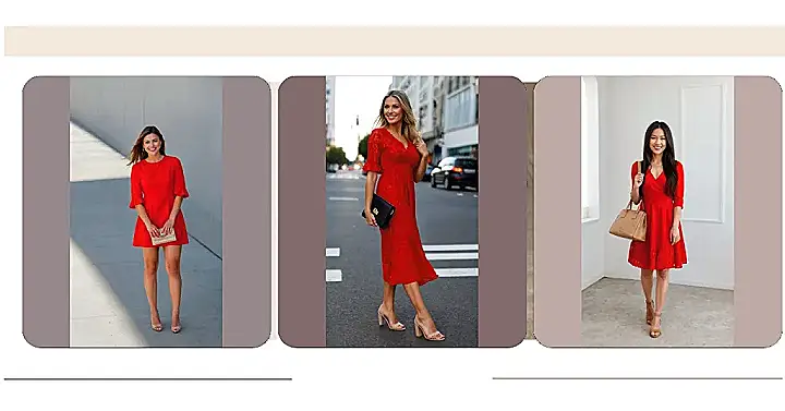 Putting on a red dress outfit like this basically means you’re activating your superpower for the day. One minute you’re just chillin’, and the next, you’re strutting around looking like you just won an imaginary award for ‘Best Dressed Human’ – all thanks to that pop of color. The super chic nude heels and cute little matching bag are like the perfect backup singers, letting the main star (the dress!) shine without stealing the spotlight. It’s the kind of look that makes you want to walk a little taller, smile a little wider, and maybe even spontaneously break into a dance-off with your reflection. Instant confidence boost, anyone?
