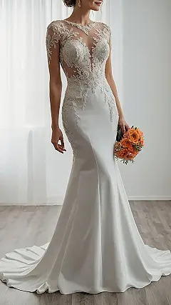 This gorgeous dress is basically giving us a sneak peek into what’s going to be super trendy for 2025 wedding dresses. See that super cool sheer top with all the intricate lace details? That’s not just pretty, it’s a major style statement that lets you look elegant and modern all at once. It’s like wearing a work of art that also says, “I woke up like this, totally fabulous!” Plus, the way it hugs the body before flaring out makes you feel like a movie star ready for her big red carpet moment, or, you know, her walk down the aisle.