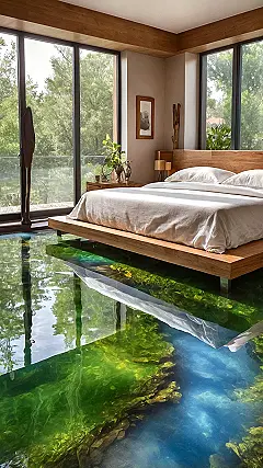 Check out this room! You might think you woke up in a serene forest, ready to dip your toes into a crystal-clear stream right from your bed. Don’t worry, you haven’t moved to a houseboat (unless that’s your secret dream!). This incredible floor looks so real, you’d almost expect a tiny fish to swim by. It’s all thanks to super cool epoxy flooring, which lets you bring an entire underwater world or a peaceful river right into your bedroom. Just try not to get confused when you’re half-asleep and need to get a midnight snack – you might instinctively grab a fishing rod instead of your slippers!