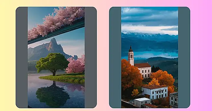 This picture is like stepping into a fairytale! It’s got everything: a majestic mountain range with snowy peaks, a sleepy little town nestled in the valley, and a charming church with a steeple that seems to reach for the clouds. It’s almost like the mountains are protecting this peaceful town, and the church is there to watch over it all. The trees are starting to change color, which means fall is officially here, and those fiery reds and oranges just add to the beauty of the scene.