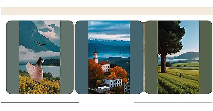 This picture is like stepping into a fairytale! It’s got everything: a majestic mountain range with snowy peaks, a sleepy little town nestled in the valley, and a charming church with a steeple that seems to reach for the clouds. It’s almost like the mountains are protecting this peaceful town, and the church is there to watch over it all. The trees are starting to change color, which means fall is officially here, and those fiery reds and oranges just add to the beauty of the scene.