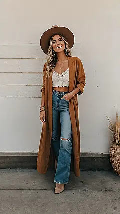 This outfit is like a hug for your soul! It’s comfy but cool, like wearing your favorite blanket but looking like a total rockstar. The long brown jacket is like the ultimate accessory for fall – it’s warm, it’s stylish, and it’s perfect for layering. The jeans are so cute, they’re kind of like a mix of vintage and modern. And that hat? It’s like a crown for your head, making you feel like you’re ready to conquer the world, even if you’re just going to the coffee shop.