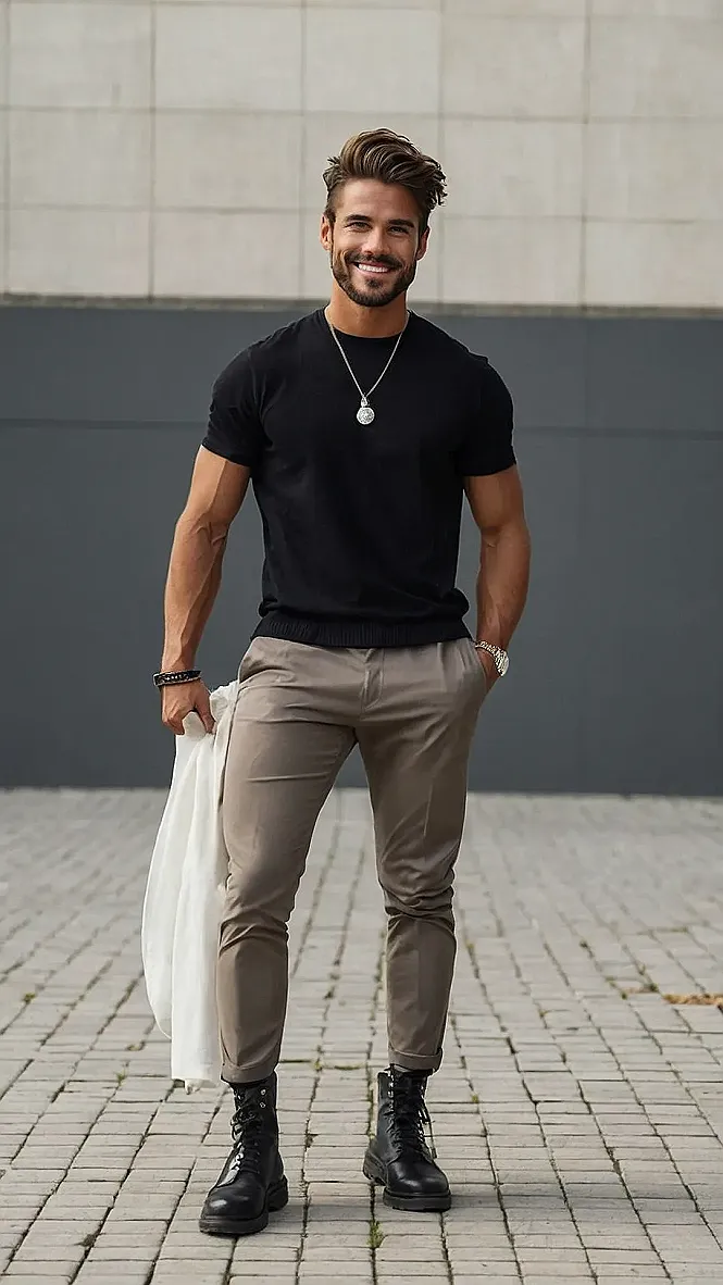 This guy is rocking the effortless cool look, making us all wish we looked that good just rolling out of bed! He’s keeping it simple with a black t-shirt, but those khaki pants are giving off some major style vibes. And let’s not forget the boots! They’re definitely the statement piece, adding a bit of edge to his whole outfit. It’s like he just stepped out of a fashion magazine, even though he probably just went to the store for milk (but maybe not, those are some nice boots).
