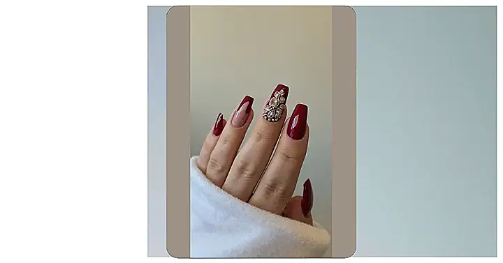 This picture shows off some seriously glam nails. The deep red polish is like a fancy velvet dress for your fingertips, and it just makes you feel like a total rockstar. The sparkling ring on the finger is like a little secret that only YOU know about. It’s the perfect way to add a touch of sparkle to your look without going overboard.