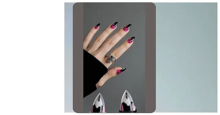 These nails are seriously spooky, but in a totally chic way! They’re like a Halloween party on your fingertips, with a mix of pink and black designs, and a super cute little bat ring. It’s like a grown-up, stylish take on your classic Halloween decorations, but instead of pumpkins and ghosts, you’ve got nail polish and a killer bat ring.