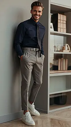 This guy is rocking a classic men’s clothing style! Think clean lines, a crisp button-down shirt, and sleek gray pants. He’s giving off serious “I’ve got this” vibes, ready to take on the world. It’s a look that’s timeless and never goes out of fashion.