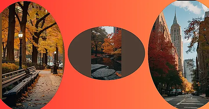 The picture shows a beautiful scene in New York City during autumn. The leaves on the trees are turning all sorts of fiery colors, like a giant painting splashed with reds, oranges, and yellows. You can even see a tall skyscraper in the background, almost like it’s watching the leaves fall and the city change. The whole scene makes you think about cozy sweaters, pumpkin spice lattes, and maybe even a romantic walk in the park. It’s like a postcard straight from a dream!