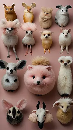 This picture is like a whole bunch of fluffy clouds came to life! Each adorable animal is wearing its best fuzzy outfit. It’s almost hard to pick a favorite—do you like the pink, poofy fox, or the fluffy bunny with the big, friendly eyes? Maybe you’re more into the little bird with the crazy hair, or the cute, tiny white mouse! No matter what, this picture will make you smile and want to give all these critters a big, squishy hug.