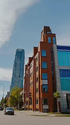 The image shows a building in Canada, maybe Toronto or Vancouver, with a mix of old and new styles. It looks like someone took an old, brick building and gave it a modern makeover. The tall, sleek building in the background with its bright blue glass windows is the new kid on the block, but the brick building in the foreground is like the cool grandpa who remembers when the city was just a bunch of fields.