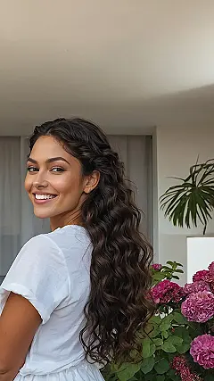 This girl’s got long, luscious curls that could make a mermaid jealous! It looks like she’s having a blast, rocking those big, bouncy waves with a smile that could melt an iceberg. Maybe she’s just enjoying the feeling of her hair, or maybe she’s about to go out and rock the night! Whatever the reason, it’s clear that she’s confident and comfortable with her awesome hair, and that’s what really makes her shine.
