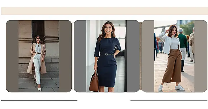 She looks super stylish, but also totally comfortable – like she could go from a boardroom meeting to a coffee break with friends without missing a beat. This outfit is proof that you can be both professional and fashionable at the same time. It’s like a secret superpower, but instead of flying, you just look amazing and get things done!