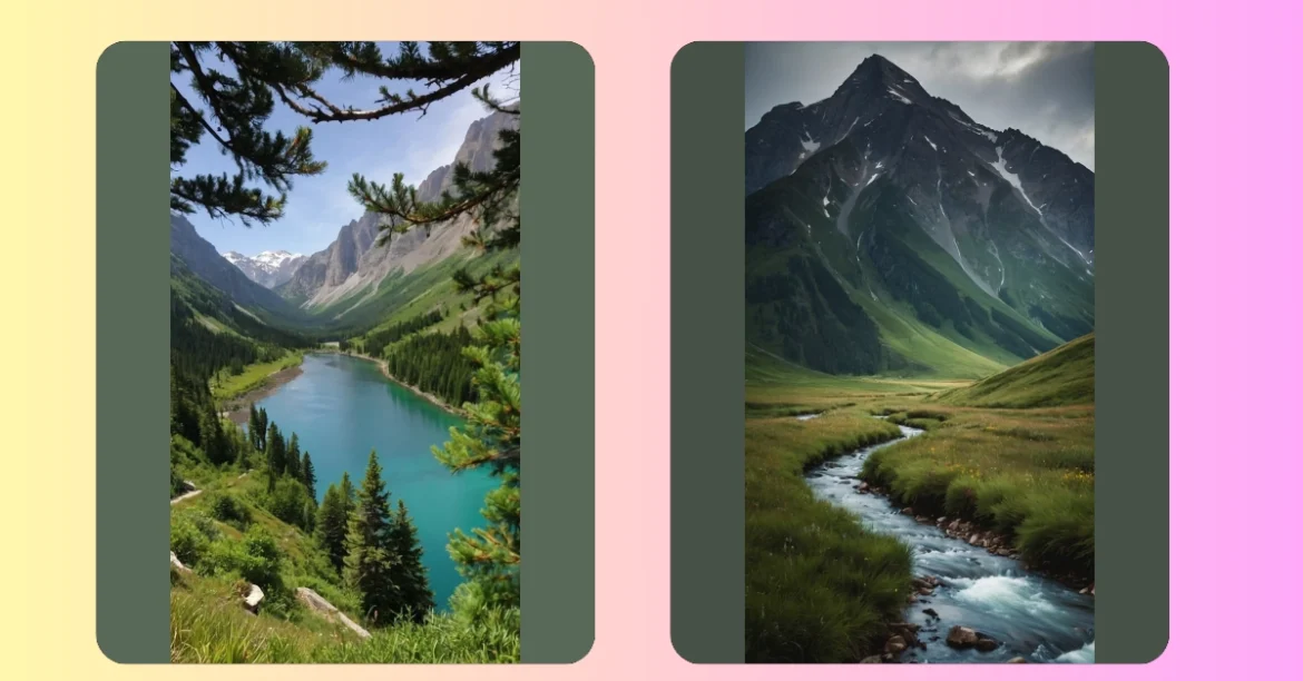 The picture shows a beautiful mountain scene with a crystal-clear stream flowing through a lush green valley. It’s like a scene from a fairytale! The towering mountains are so high they seem to touch the clouds, and the soft, fluffy clouds drift lazily across the sky, making you feel like you could reach out and touch them. It’s like something out of a movie!