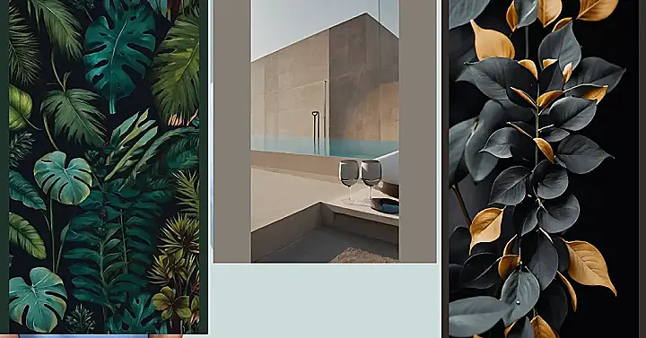 This picture is like a breath of fresh air. The pool looks so still and peaceful, like you could just jump right in and float away. All those giant leaves hanging on the wall make it look like a jungle, but it’s still super calm and zen. It’s like the plants are saying, “Chill out, relax, and enjoy the quiet beauty of this moment!”