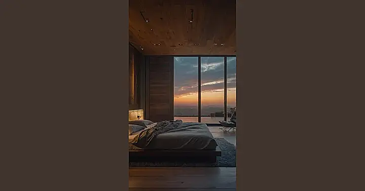 Imagine waking up in this room, with the sun pouring in through those huge windows! It’s like having your own private sunrise show every morning. The wooden walls and ceiling give the room a cozy, cabin vibe, but the sleek bed and modern furniture make it feel super fancy. It’s the perfect place to curl up with a good book and forget about all your worries.