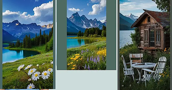 This picture is like a postcard from a fairytale! A little red cabin sits beside a peaceful lake, surrounded by lush green trees. The water is so still, it’s like a giant mirror, reflecting the whole scene back up to the sky. It’s almost like the clouds are trying to hide from the mountains in the background, and the flowers are blushing shyly at the beautiful view.