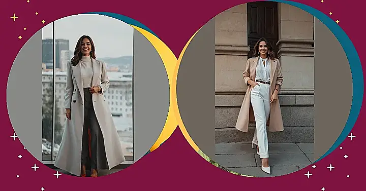 It’s super cute how she’s smiling, and the white coat really makes her stand out against the grey background. This look is perfect for anyone who wants to feel confident and stylish, like they’re ready to take on the world! You know, like she’s about to walk into a big meeting and get that promotion, but with much more style!