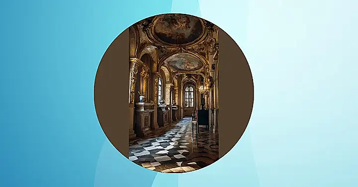 This picture is like stepping into a fairytale! Just imagine you’re walking through the palace, maybe even wearing a fancy dress, and you suddenly come across this incredible room. It’s so grand, with all that gold and the fancy swirls on the walls, it’s like something out of a movie! The blue and gold colors make it look like a royal treasure chest, and you can almost hear the echoes of a grand waltz playing in the background. This is what’s called Baroque architecture, and it was all the rage back in the 1600s. Basically, people wanted everything to be as fancy and elaborate as possible. Can you even imagine having a room like this in your house?!