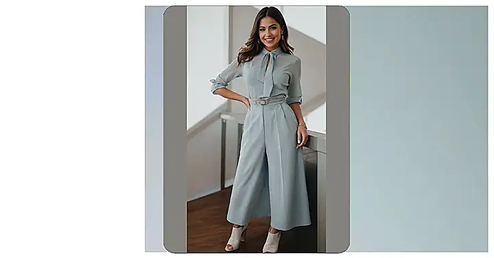 This outfit is so elegant, it practically screams “I’m a boss!” She’s rocking a sky-blue jumpsuit with a cute little bow tie, and it looks like she’s ready to take on the world! The wide-legged pants are super comfy and stylish, and the belt cinches in her waist to give her a flattering figure. Plus, she’s got a little smile on her face that says she knows she looks amazing. Who wouldn’t want to rock this outfit?