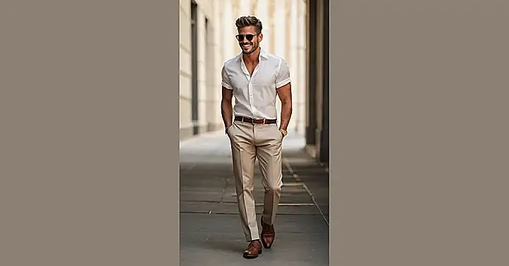 This guy is rockin’ the classic men’s style look! A crisp white shirt, khaki pants, and brown shoes? That’s like the holy trinity of looking sharp. You can totally wear this outfit to school, to hang out with friends, or even to a semi-formal dance. It’s just that versatile. It’s like the ultimate fashion chameleon – it can blend in or stand out, depending on what you add to it.