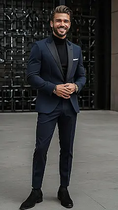 This guy looks like he’s ready to take on the world! He’s got a sharp navy suit and a slick black turtleneck that’s so fancy, it makes even a plain black shirt look boring. His shoes are perfect for stepping out in style, and he’s rocking a watch that screams “I’m a grown-up.” This outfit is the epitome of “men’s formal outfits.”