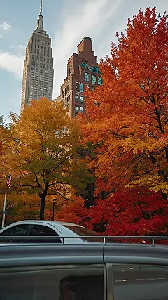 The picture shows a beautiful scene in New York City during autumn. The leaves on the trees are turning all sorts of fiery colors, like a giant painting splashed with reds, oranges, and yellows. You can even see a tall skyscraper in the background, almost like it’s watching the leaves fall and the city change. The whole scene makes you think about cozy sweaters, pumpkin spice lattes, and maybe even a romantic walk in the park. It’s like a postcard straight from a dream!