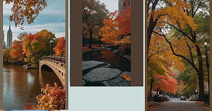 The picture shows a beautiful scene in New York City during autumn. The leaves on the trees are turning all sorts of fiery colors, like a giant painting splashed with reds, oranges, and yellows. You can even see a tall skyscraper in the background, almost like it’s watching the leaves fall and the city change. The whole scene makes you think about cozy sweaters, pumpkin spice lattes, and maybe even a romantic walk in the park. It’s like a postcard straight from a dream!