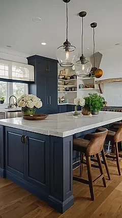 This kitchen is like a breath of fresh air – sleek, simple, and super stylish! Imagine coming home after a long day and walking into this space. The dark blue cabinets and white countertops are like a classic movie star in a chic black dress, and the light wood floors add a touch of warmth. Plus, those gorgeous pendant lights are like the perfect accessories, not too much, just enough to make a statement.