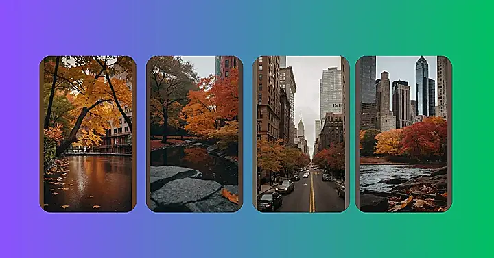 The picture shows a beautiful scene in New York City during autumn. The leaves on the trees are turning all sorts of fiery colors, like a giant painting splashed with reds, oranges, and yellows. You can even see a tall skyscraper in the background, almost like it’s watching the leaves fall and the city change. The whole scene makes you think about cozy sweaters, pumpkin spice lattes, and maybe even a romantic walk in the park. It’s like a postcard straight from a dream!