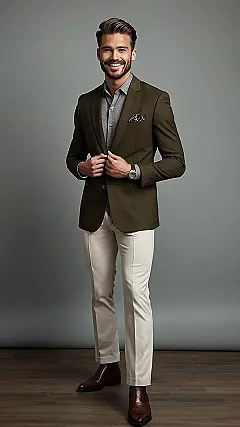 This guy’s got the whole “classic men’s clothing style” thing down pat! He looks like he just walked out of a vintage fashion magazine, but with a modern twist. That navy blazer is super sharp, and those brown pants are just the right shade of “I’m-totally-in-charge-but-still-down-to-earth.” And don’t even get me started on that pocket square – it’s like a little burst of personality that says, “Hey, I’m a sharp dresser, but I’m not afraid to have some fun with it.”