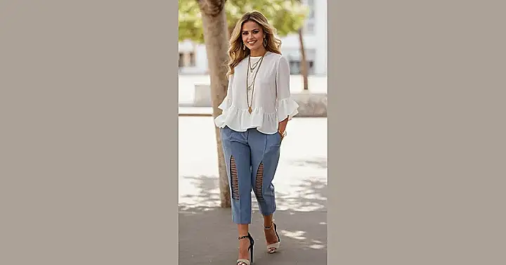 And let’s not forget the white blouse! It’s got a little ruffle detail that adds some extra flair, and it’s just the right amount of breezy and cool for a summer day. Plus size fashion is all about finding clothes that make you feel good, both inside and out. So go ahead, embrace your curves and rock those awesome pants!