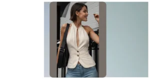 Forget skinny jeans and tight dresses! This outfit is all about feeling confident and comfortable. Check out those awesome wide-leg pants! They’re like a stylish hug for your legs, and they make you feel like you can conquer anything. That cute top with the button-up collar is the perfect match – classic and chic! Plus, that belt is just the cherry on top, adding a bit of sparkle and personality to the whole look.