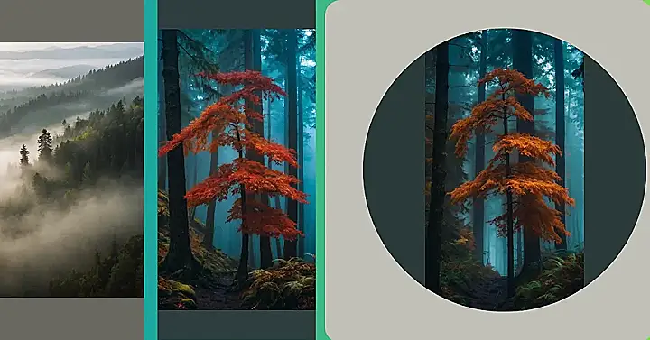 This picture looks like a scene from a fairytale! It’s a foggy forest, but not just any foggy forest. This one has a special tree, with leaves that look like they’re on fire! It’s a bright splash of color in a world of grey and green. You can almost hear the wind whispering secrets through the trees, and imagine a magical creature hiding behind one of the big, mossy trunks.