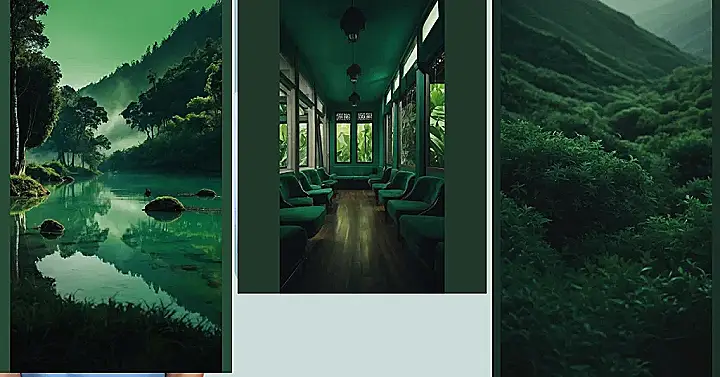 This picture is like a dream, all green and cozy, like walking into a secret garden. It’s got everything: plush green chairs that look like they’re begging you to sink into them, a dark green ceiling that makes you feel like you’re in a secret club, and windows with green plants that peek out like little mysteries. Imagine coming here with your friends, chilling out, and talking about your dreams. This room is like a giant green marshmallow, super comfy and ready to absorb all your worries.