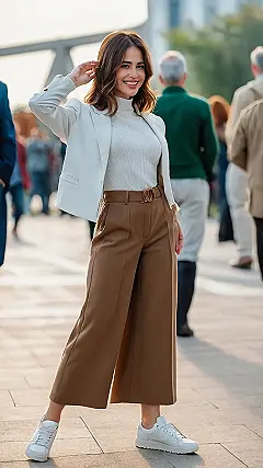 This lady is rocking a look that’s totally boss-worthy! Her white blazer, turtleneck, and wide-legged pants are a classic combination that’s sure to make her stand out from the crowd. She even has a cool belt with a fancy buckle that adds a touch of glam to the whole outfit. With those white sneakers, she’s ready to take on the day, conquer the world, and maybe even snag a promotion!