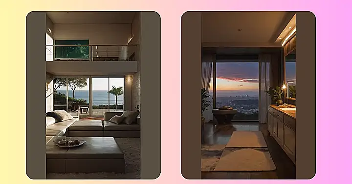 This room is like something out of a magazine! It’s got all the fancy stuff, like a giant bed and a fluffy rug, but the best part is definitely the windows. You can see the ocean and the sky, and it looks like the sun is just about to set. Imagine waking up to that every morning! You’d probably feel like a king or queen, even if you’re just a regular teenager.