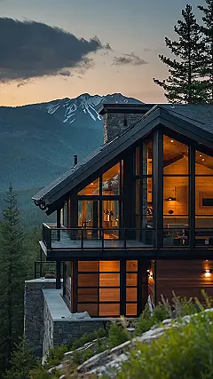 This house isn’t your grandma’s cabin! It’s got all the cool features of a modern home, like giant windows and sleek lines, but it’s also nestled in the mountains, surrounded by tall trees and fresh air. It looks like a place where you could chill out in the evenings watching the sunset, and then maybe even jump in the pool to cool off!