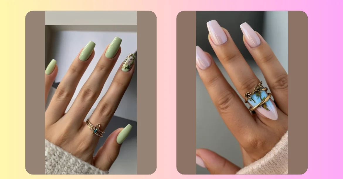This picture shows nails that are totally giving off a springtime vibe. The green polish looks like a little patch of grass you’d find in the park, while the pink polish is like the prettiest petal on a rose. And don’t forget the flower ring! It’s like the nails are ready to welcome all the amazing things that come with warmer weather.