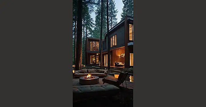 This picture shows just that, with its inviting outdoor seating area centered around a crackling fire pit. This is “Nature Living Spaces” at its finest. Imagine relaxing in this beautiful setting, feeling the warmth of the fire and the coolness of the forest air. It’s a place where you can escape the hustle and bustle of city life and truly connect with nature.