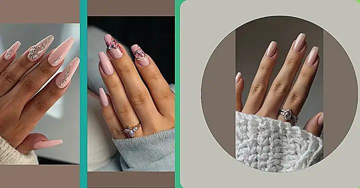 The picture shows some seriously stylish nails! They’re painted a soft pink color that’s perfect for fall, kind of like the color of a warm pumpkin spice latte (but without the sugar rush). And check out that bling on one of the nails! It’s like a sprinkle of tiny stars, adding a touch of glitz to an otherwise simple look. Who knew a little sparkle could make such a big difference?