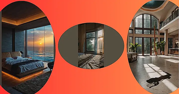 Imagine waking up to this view! This picture shows a bedroom with a giant window looking out over the ocean. The sun is setting, casting a warm glow over everything, and the waves crashing against the shore. It’s the kind of scene that makes you want to just stay in bed all day and watch the world go by. But don’t worry, if you get bored of staring at the sunset, you can always cozy up in that big fluffy bed. It looks incredibly comfy. Maybe you can paint the room a calming mint green to match the ocean view – just imagine how relaxing that would be!