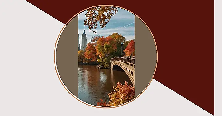 The picture shows a beautiful scene in New York City during autumn. The leaves on the trees are turning all sorts of fiery colors, like a giant painting splashed with reds, oranges, and yellows. You can even see a tall skyscraper in the background, almost like it’s watching the leaves fall and the city change. The whole scene makes you think about cozy sweaters, pumpkin spice lattes, and maybe even a romantic walk in the park. It’s like a postcard straight from a dream!