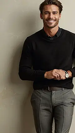 This guy is rocking the classic men’s clothing style! He looks like he stepped right out of a fashion magazine, or maybe a vintage movie. With a sleek black sweater, perfectly tailored pants, and a watch that screams “I’ve got my life together,” this dude is all about timeless style. Forget those crazy trends that come and go faster than your last school project, this is a look that will always be in style.