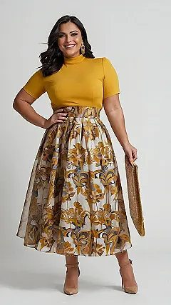 This outfit is totally rocking the “plus size fashion” scene! Just look at that amazing floral skirt, it’s like a beautiful garden bursting with color! And that mustard yellow top, it’s like a ray of sunshine on a cloudy day! The whole look is so confident and stylish, you’d never guess that this lady was worried about her size!