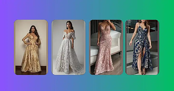 This dress is like a beautiful, blooming garden that you can wear! It’s covered in delicate flowers, and the whole thing looks super fancy, like something a princess would wear to a fancy tea party. The lace is super delicate and looks like it could melt in your hand!
