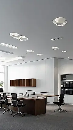 This office looks like it’s straight out of a design magazine, with its sleek, modern furniture and bright, airy feel. The long, wooden desk with its matching chairs makes it look like a place where serious work gets done, but with a touch of style. I bet the people who work here get a little jealous of the ceiling, which is covered in cool, cloud-shaped light fixtures! It’s like having a little piece of the sky in the office, which is pretty cool, right?