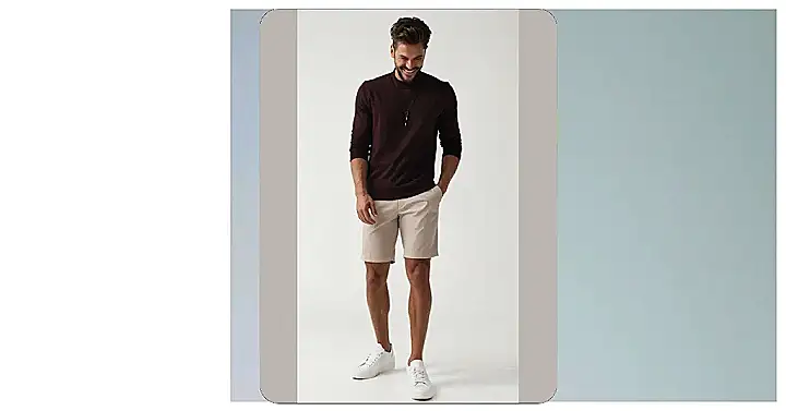 This guy is rocking the classic men’s clothing style, but with a modern twist! His burgundy turtleneck is a timeless choice, but it’s not your grandpa’s sweater – it’s sleek and fitted. Those khaki shorts are just the right length to show off his killer calves (sorry, girls, I’m just saying what we’re all thinking!). And let’s not forget those crisp white sneakers that are totally the perfect complement to his cool vibes.