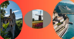 The sun is setting, painting the sky with gorgeous colors that look like a painter’s palette exploded. It’s casting long shadows across the rolling hills, making them look like giant, green waves. The whole scene is so peaceful, you can almost hear the grass whispering secrets to the wind. It’s like a picture perfect postcard from a place where time slows down and worries melt away.
