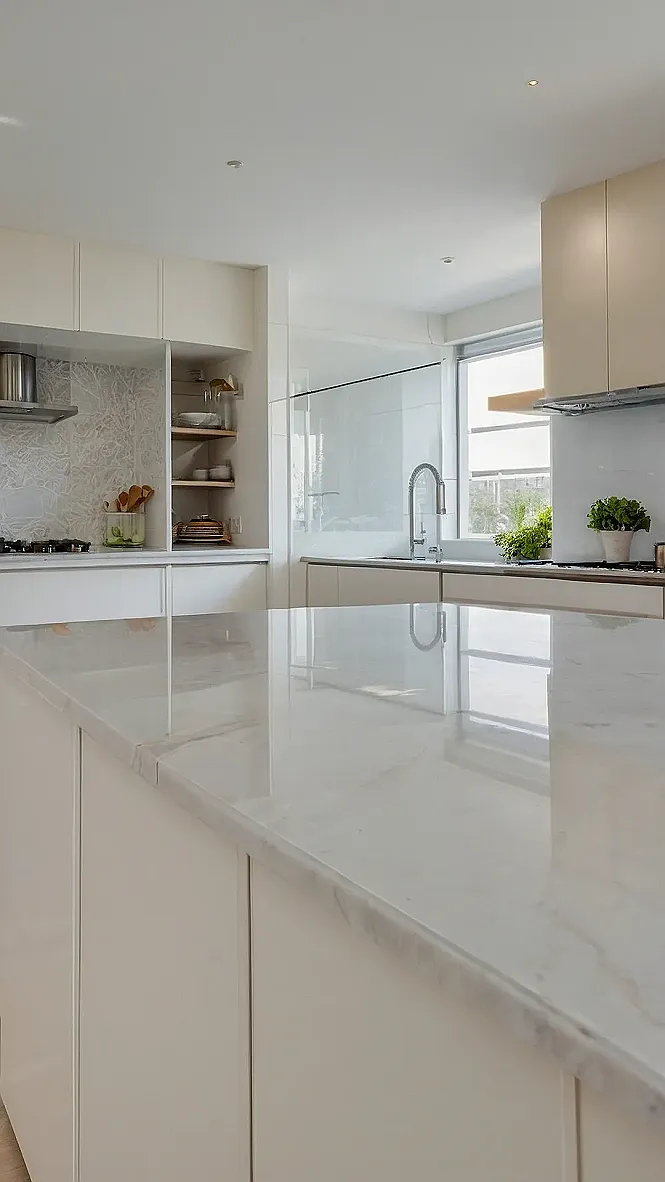That kitchen looks like it’s ready for a cooking show! Just imagine yourself whipping up delicious meals on that sleek, shiny countertop. It’s like a blank canvas waiting for your culinary masterpieces. The modern design, with those cool cabinets and the long, stylish lights, makes it feel like a gourmet kitchen straight out of a magazine.