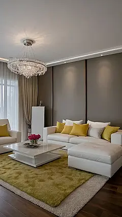 This living room looks like the perfect place to relax and unwind after a long day. The fluffy rug, the big comfy couch, and the soft pillows make it feel like a cozy haven. You can imagine yourself curled up on the couch with a good book and a cup of hot cocoa, watching the world go by.