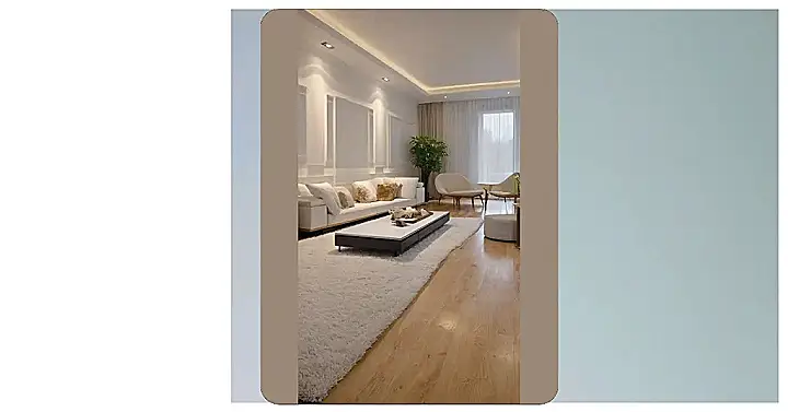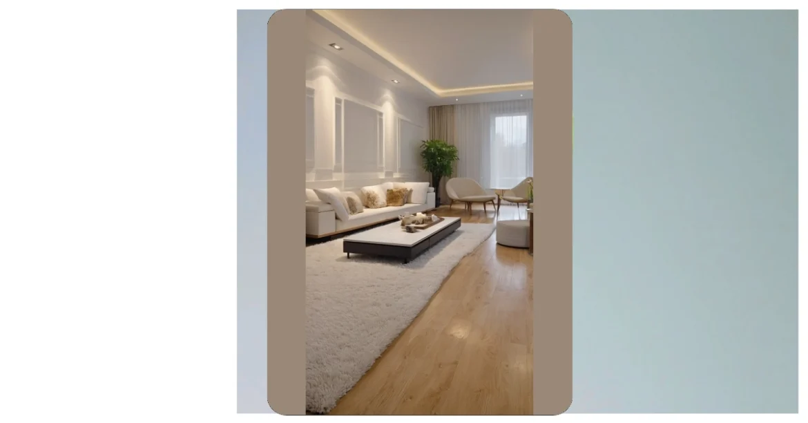 This living room is so chill it makes you want to grab a book, a cup of hot cocoa, and just relax. It’s like the opposite of a wild party; instead of chaotic energy, it’s full of comfy vibes. The big, soft couch looks like the perfect place to snuggle up with a good movie, and the big windows let in tons of sunshine. Even the rug is comfy-looking, with its fluffy texture and round shape.